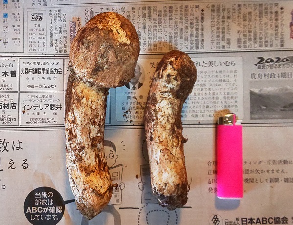 松茸狩りも終盤なので、傘開きが有るかな~と探しても無し。シロを見て、土の盛り上がり部分を手で押さえて1本発見。その近くでさらに1本、合計2本。地表に頭が出ていなくてこのサイズです。来週もどうしようか?行こうかな~?
